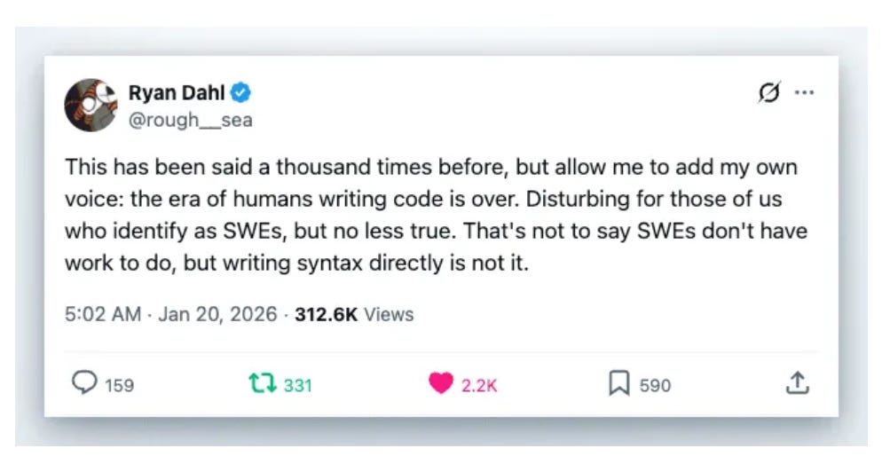 šļø The creator of Node.js says the era of writing code is over in a massively viral Tweet.
