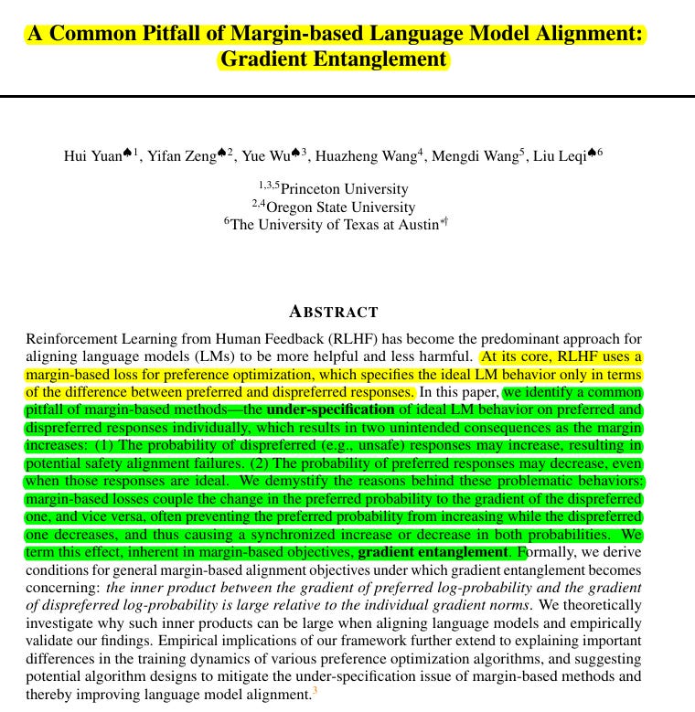 📌 The paper identifies a common pitfall in margin-based language model alignment methods: they under-specify the ideal behavior of the language model on chosen and rejected responses individually.