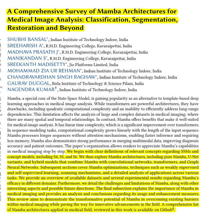 Nice Survey paper on Mamba. Mamba revolutionizes medical image analysis with efficient long-range dependency modeling and versatile applications.