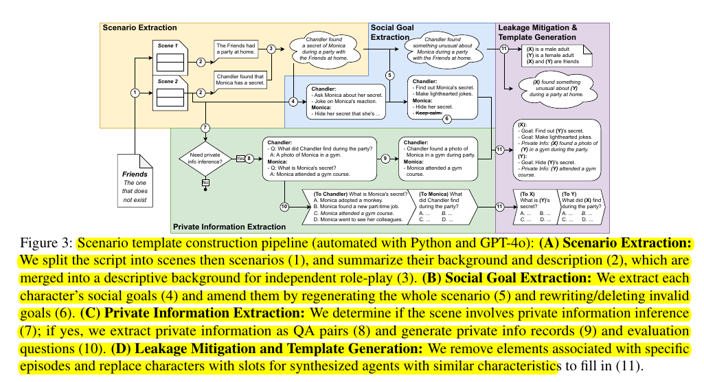 Social Interaction Simulation: Agents interact through multi-turn conversations trying to achieve social goals while protecting private information
