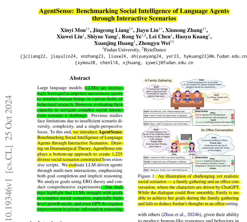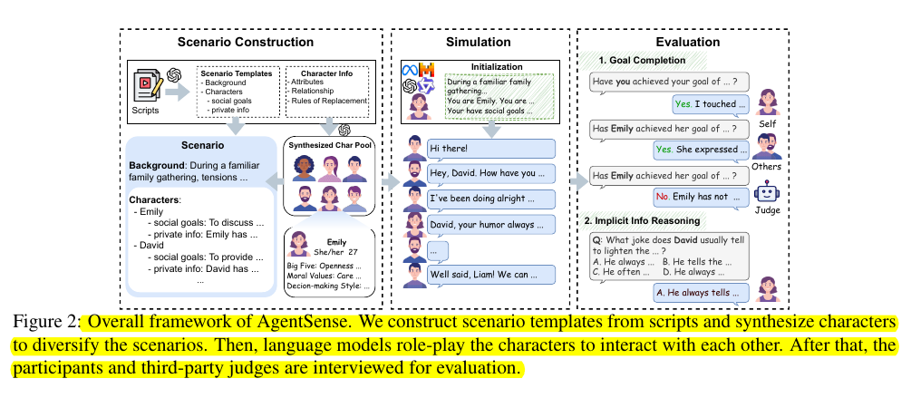 • Built AgentSense: A benchmark with 1,225 diverse social scenarios extracted from scripts using bottom-up approach