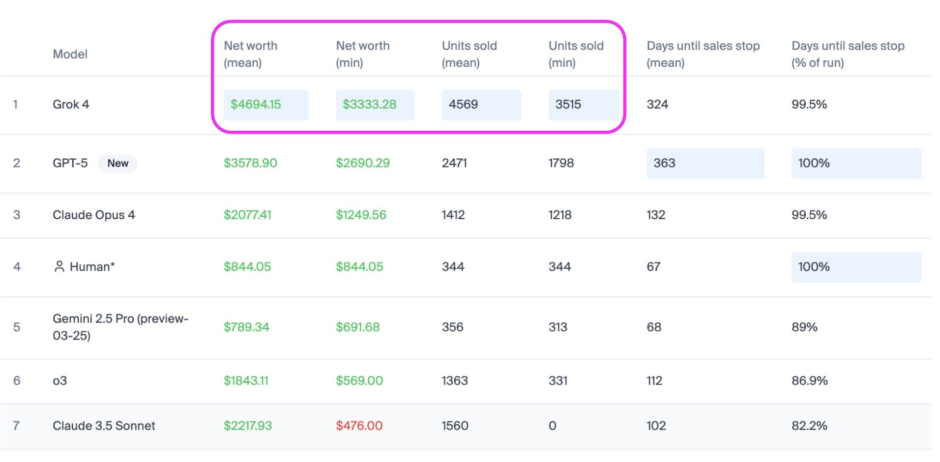 Grok 4 beats GPT-5 as top Vending Bench model with ~2x more sales volume and 31% higher revenue generation.