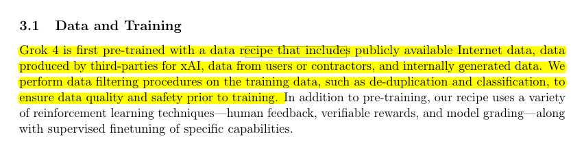 Pretraining pulls from 4 sources, public Internet data, third-party data for xAI, user or contractor data, and internally generated data.
