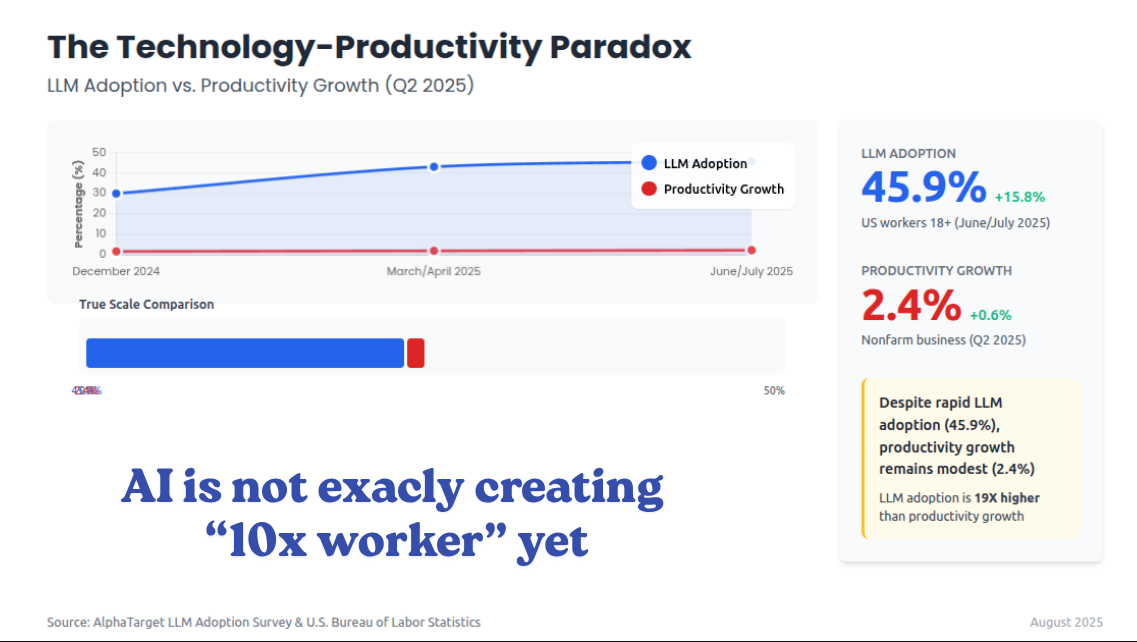 LLM adoption rose significantly 45.9% among US workers. But, macro productivity has not surged. U.S. as shown by Govt data.