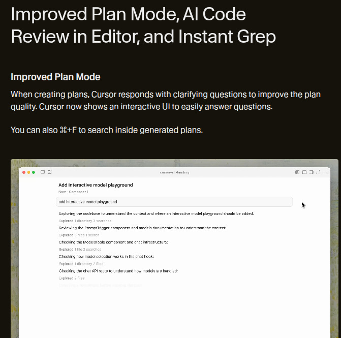 Together these changes make Cursor a stronger everyday assistant because planning, review, and search now live as fast, first class flows inside the editor instead of fragile prompts in a separate chat window.