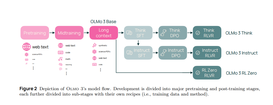 Olmo 3 sits on 3 main tracks built from the same base models, Olmo 3 Base (7B, 32B) for general capability, Olmo 3 Think (7B, 32B) for long, explicit reasoning traces, and Olmo 3 Instruct (7B) for fast chat and tool use, plus an Olmo 3 RLZero (7B) branch focused on reinforcement learning research.