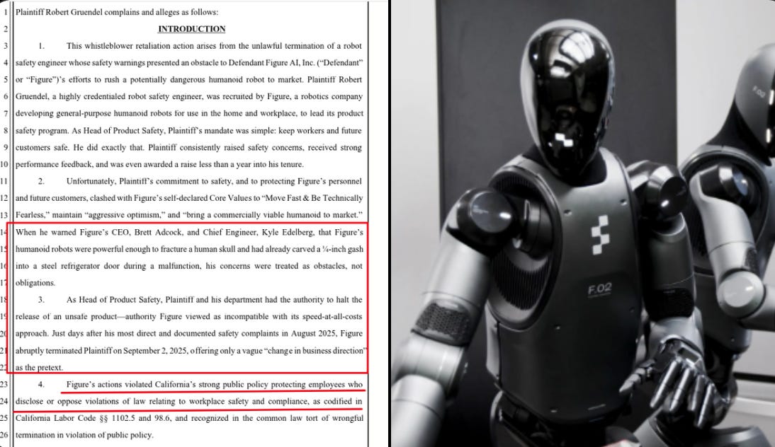 The lawsuit claims Figure AI rushed its humanoid robots toward home use, ignored serious safety warnings, and then fired its Head of Product Safety after he kept pushing for fixes. Robert Gruendel, a robot safety engineer with 20 years in the field, says he joined in 10-24 to build safety processes but soon saw powerful robots moving near people without solid procedures or incident tracking.