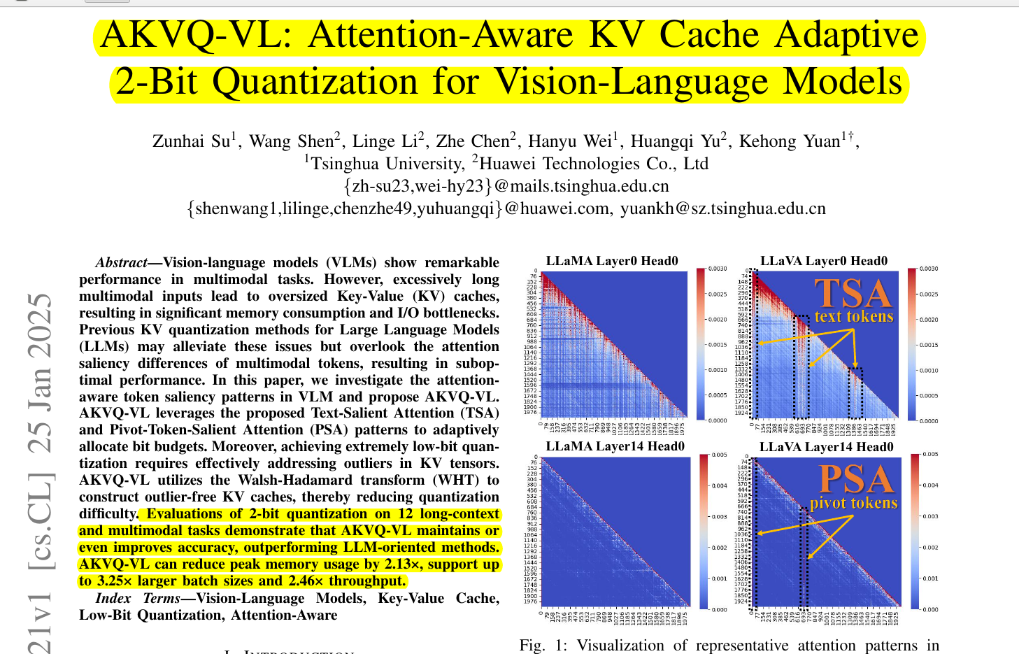 This paper introduces AKVQ-VL. It is a method designed to solve the KV cache quantization problem in Vision-Language Models by considering attention differences among multimodal tokens and reducing outliers.