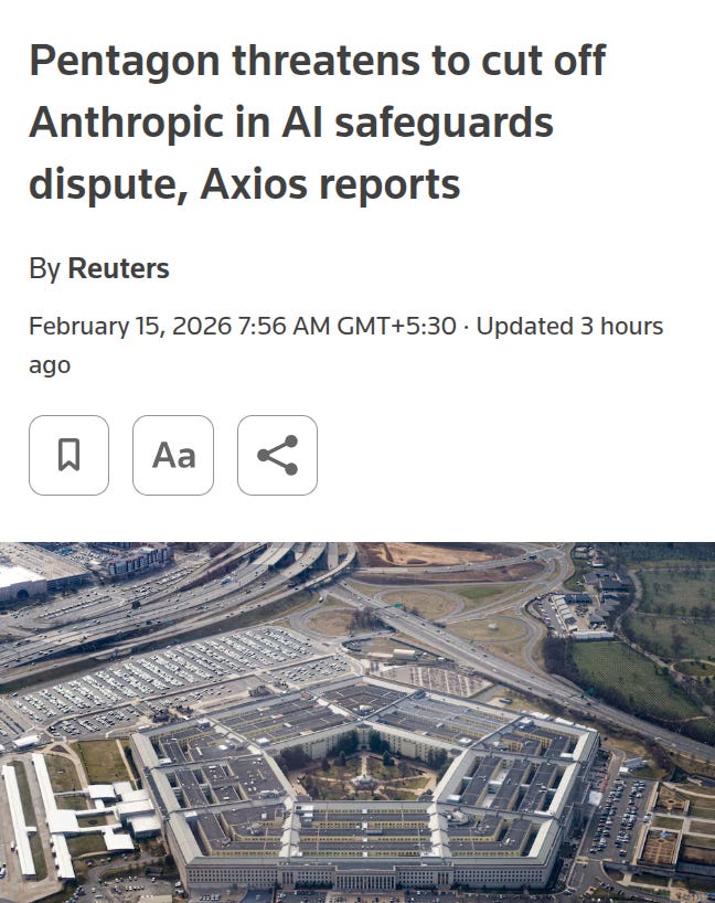 🗞️ The U.S. Pentagon is pressuring top AI labs to let the military use their models for “all lawful purposes,” and a dispute over guardrails has reportedly put Anthropic at risk of being cut off.