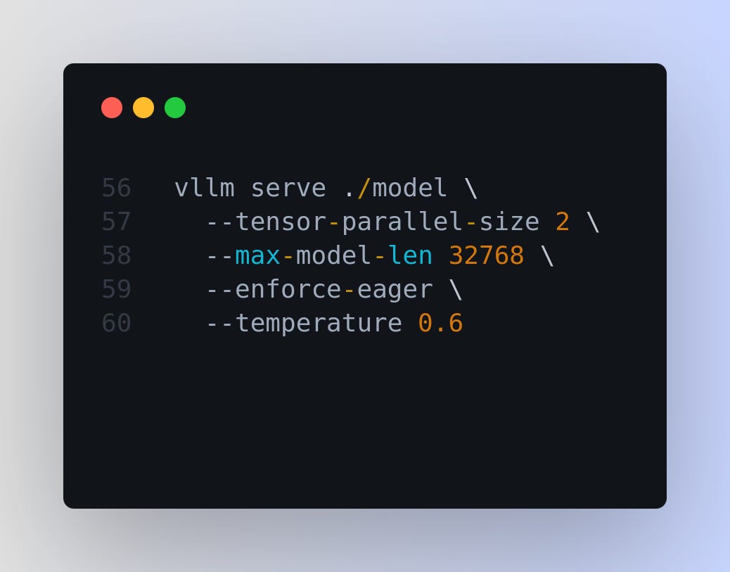- --temperature 0.6: Sets the sampling temperature to 0.6. As recommended, keeping the temperature between 0.5 and 0.7 helps prevent issues like endless repetition or incoherent outputs.