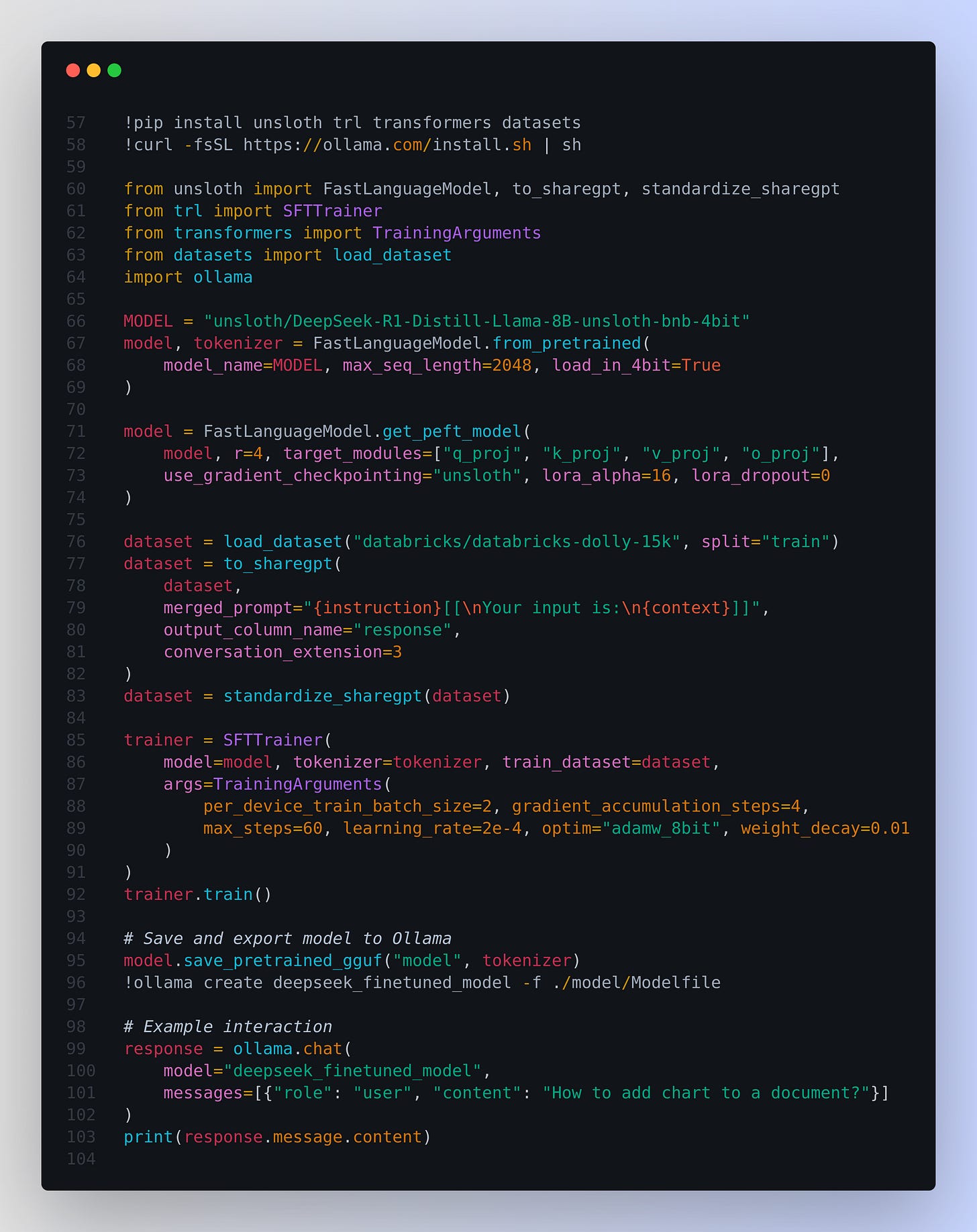 Begin by installing essential Python libraries such as- unsloth,- trl,- transformers, and- datasets. Additionally, install Ollama to facilitate local model deployment.