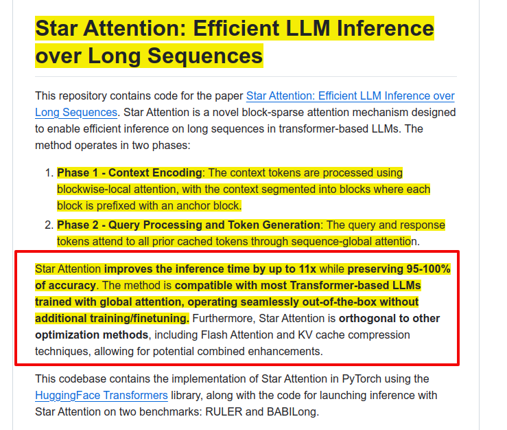 NVIDIA introduces Star Attention, a novel attention mechanism for efficient LLM inference over long sequences, achieving up to 11x speedup while maintaining 95-100% accuracy through a two-phase block-sparse approximation approach.