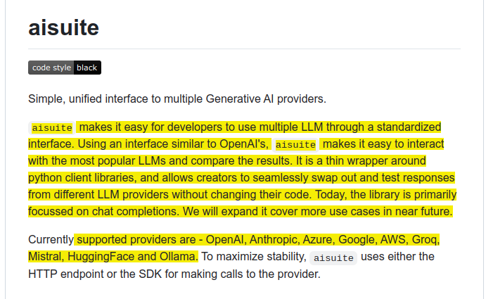 → Aisuite implements a unified interface similar to OpenAI's API, allowing developers to switch between LLMs using a simple string format: :. The framework supports nine major providers including OpenAI, Anthropic, Azure, Google, AWS, Groq, Mistral, HuggingFace, and Ollama.
