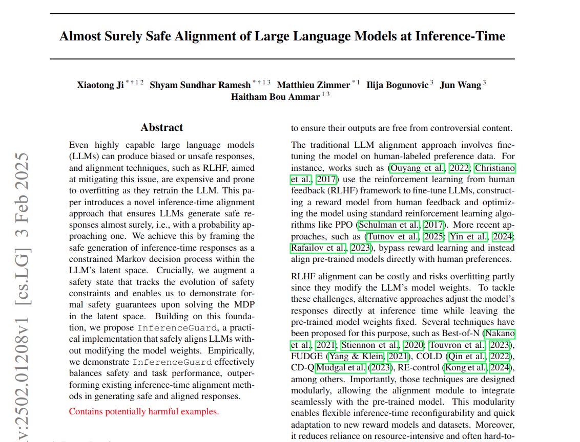 📌 Safety state augmented Markov Decision Process offers 'almost sure' safety guarantees. This is a key theoretical contribution, surpassing prior inference-time methods lacking formal safety proofs.