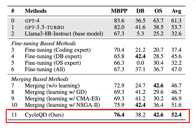 🔬 Sakana AI introduces CycleQD framework, enabling 8B models to match the performance of much larger ones, using evolutionary AI training method outperforming traditional fine-tuning by 5.4%