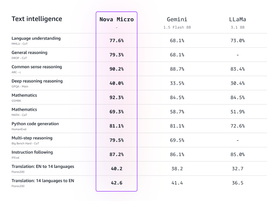 Amazon Nova Micro: A low-cost text-only model. Its a Text-only model optimized for minimal latency with 128K token context. Handles core NLP tasks like summarization, translation, and basic mathematical reasoning.
