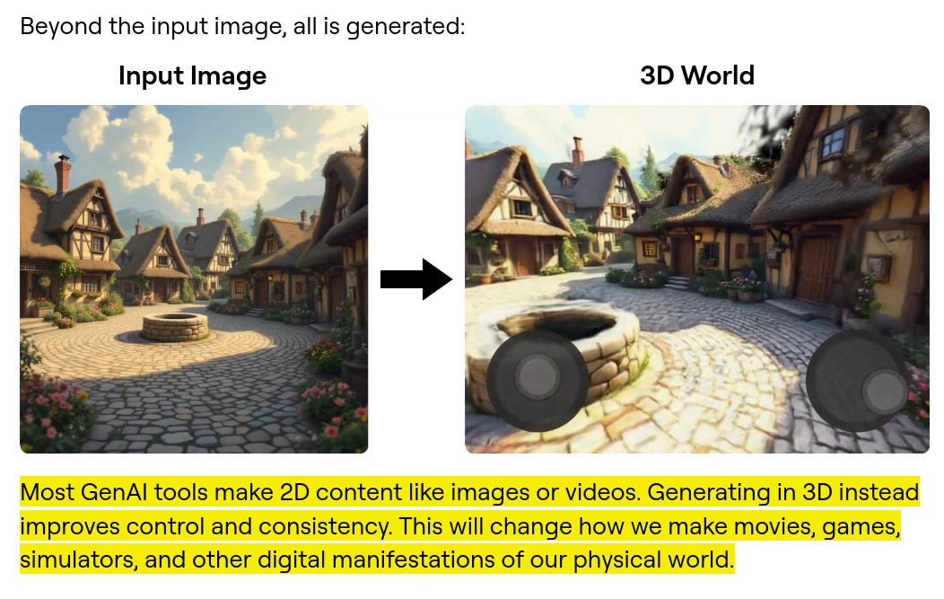 3D generation supersedes traditional 2D AI tools, enabling persistent worlds with geometric accuracy for games, films, simulations.
