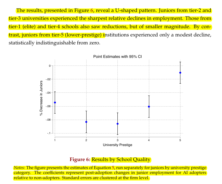 I love the analysis on how juniors are affected by hiring. Clearly, juniors need to get on the AI train, develop their own understanding of the technologies and benefits of applying them, becoming 10x employees. Not getting on the train risks their future