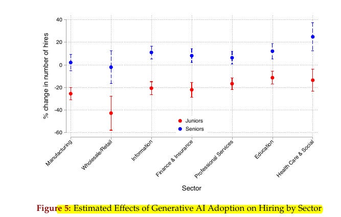 This new research shows 7.7% junior headcount decline within generative-AI adopters firms by 6 quarters, and 40% fewer junior hires per quarter in wholesale and retail.