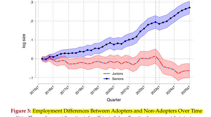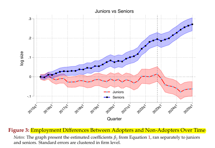 The shaded areas are uncertainty ranges, but the clear split after 2023 shows a sharp divergence, with adopters holding onto or adding seniors, while juniors shrink. So the effect of adoption is not general headcount loss, but specifically a loss of juniors relative to seniors.