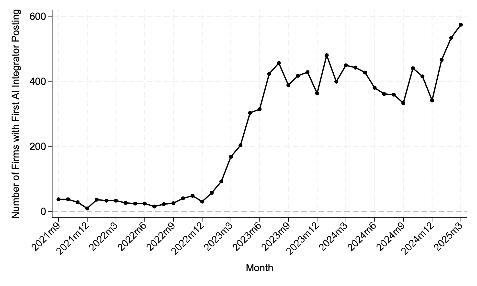 meaning a job ad explicitly asking someone to connect generative AI systems into workflows. The curve is flat through 2021 and 2022, then shoots up in early 2023, right after the public release of tools like ChatGPT. So thats when adoption really begins.