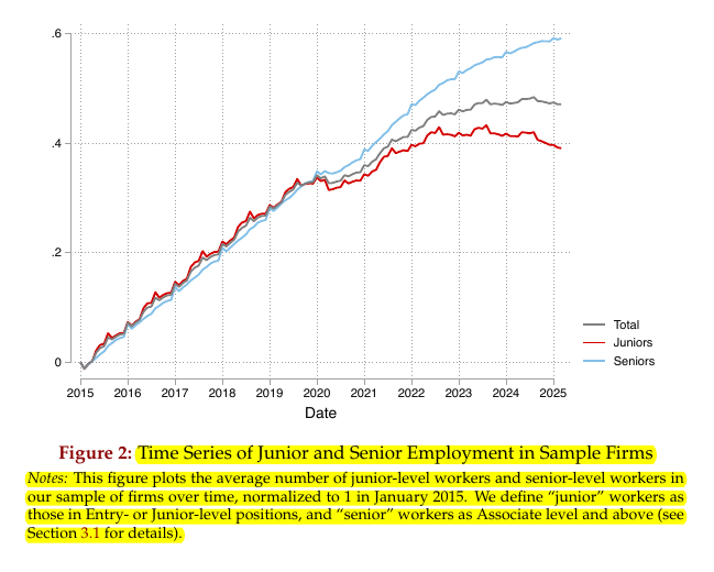 There's a clear break in timeline of befor ChatGPT and after ChatGPT: before 2022, juniors and seniors grew together, but after generative AI adoption began, seniors kept advancing while juniors fell behind in new hiring.
