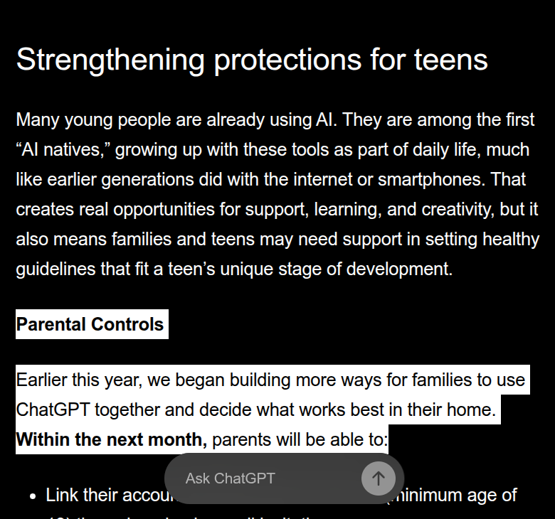 🔔: OpenAI just announced that it's rolling out parental controls for teen ChatGPT users and routing sensitive chats to reasoning models, with most changes landing over 120 days.