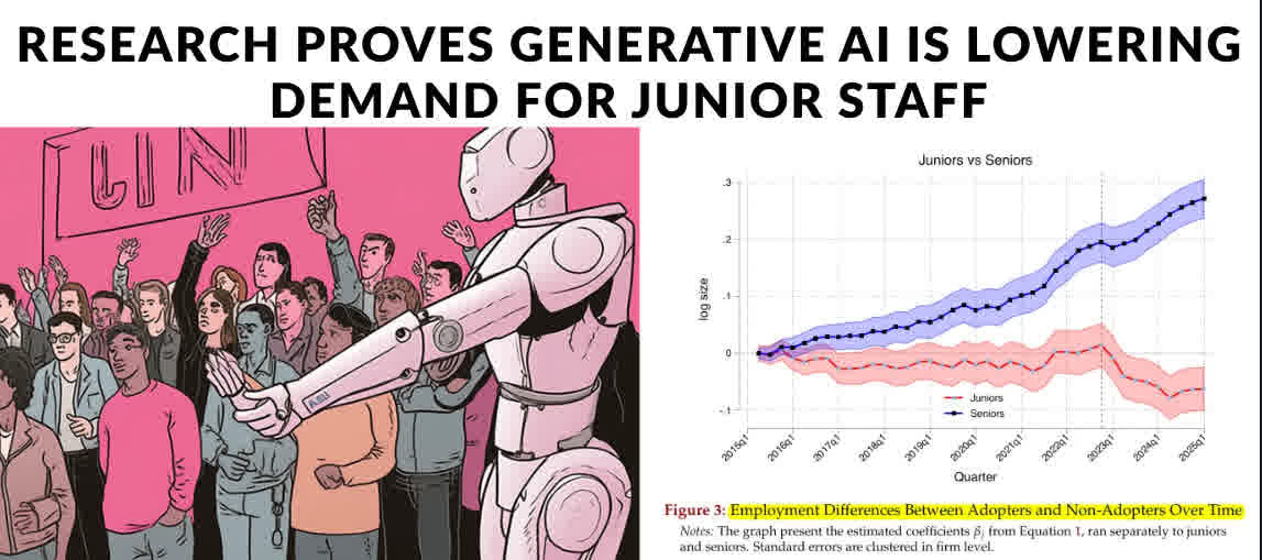 🚨 Another research proves Generative AI is lowering demand for junior staff, though senior jobs are still secure.