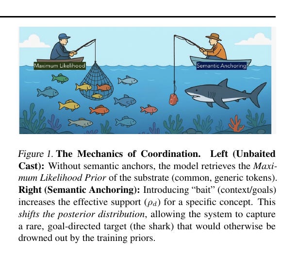 Right: clear goals or context work as bait. They focus the model on the desired idea, raising the odds of retrieving the rare, relevant answer. The point is that coordination, through goals, retrieval, or constraints, shifts behavior from generic output to the target, using little extra context.