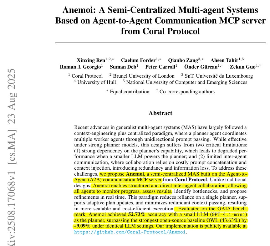 Coral Protocol introduces Anemoi, an open-source, semi-centralised multi-agent system. This is a great win for small language models (SLMs).