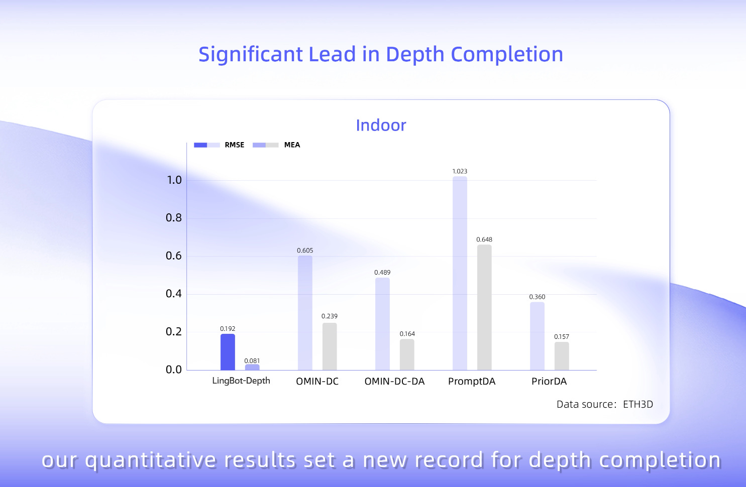 LingBot-Depth cleans up the “distance map” a robot gets from a depth camera, so the robot can build a better 3D view of the world. In real life, existing depth cameras mess up a lot on shiny metal, glass, mirrors, and dark or blank surfaces, so parts of that 3D map become holes or wrong distances.