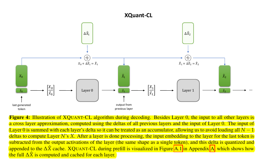 XQUANT-CL goes further by storing only small per layer deltas in X, leveraging the residual stream that keeps nearby layers similar. With this, the paper reports up to 10x memory savings with about 0.01 perplexity drop, and 12.5x with about 0.1.