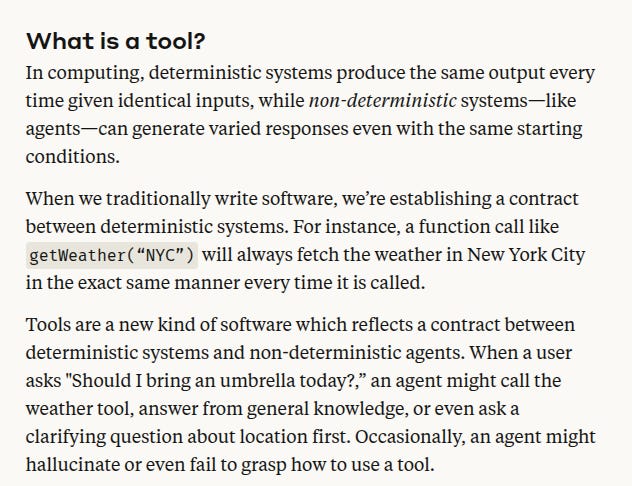 Agents are non‑deterministic, so a tool is not a simple function contract, it is a compact interface that an LLM must choose to call, understand, and sequence among many options.