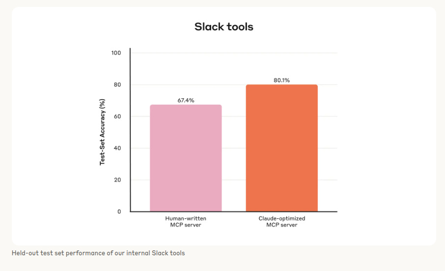 Results from internal tests show clear gains. Slack tools improved from 67% to 80% accuracy. Asana tools improved from 80% to 86%. These gains came mostly from better tool descriptions and schema changes.
