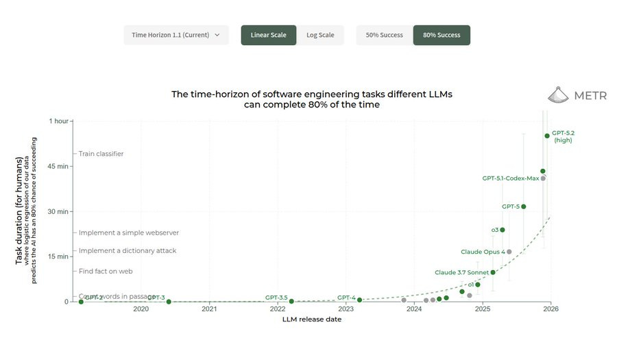 Then suddenly from 2025 bends the curve hard upward. Same benchmark, same yardstick, and most of the movement happens in 2025. This is at 80% success number, meaning it asks how long a software task can be, in human-hours, while the model still succeeds 80% of the time.
