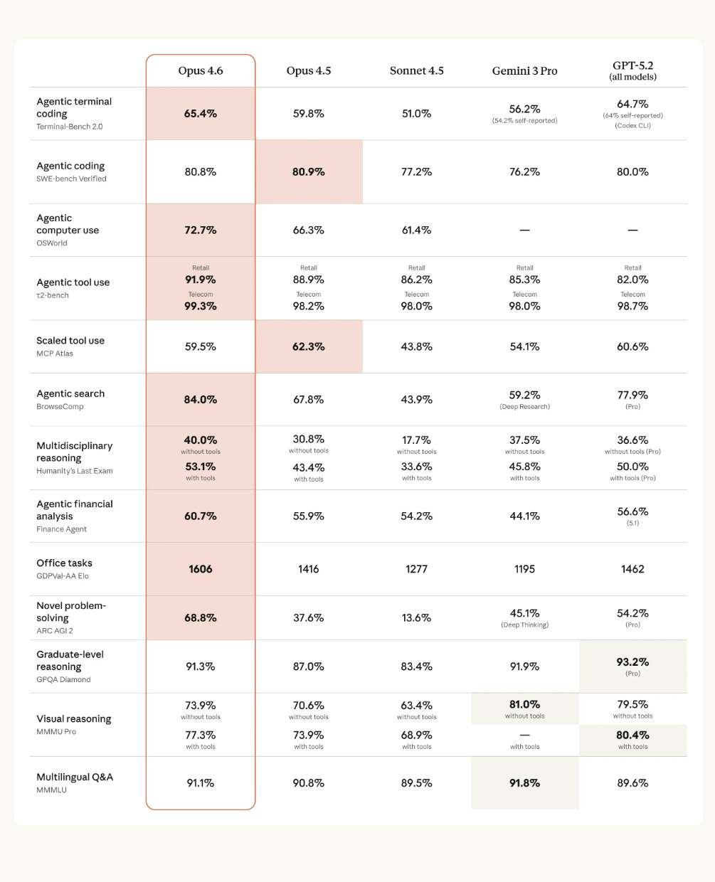 Anthropic released Claude Opus 4.6, with major gains across coding, knowledge, and reasoning benchmarks.