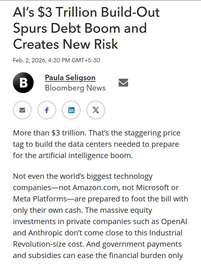 The big twist is that they are borrowing at such a huge scale that almost every kind of lending is getting pulled in, regular safe bonds, risky junk loans, private lenders, off-balance-sheet project vehicles , and packaged “bundles” of loans sold to investors. Hyperscalers and their partners are trying to finance land, buildings, grid hookups, and long-term power, at a scale that makes equity checks and subsidies a side note.