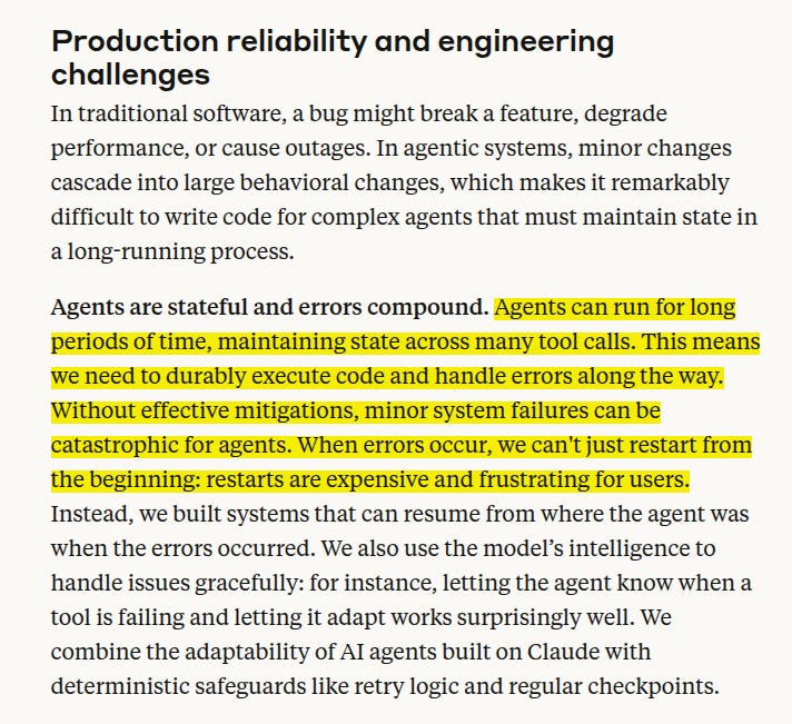 A Claude agent may call dozens of tools, branch into many sub-agents, and hold partial results that only make sense together. If a process crashes at step 17 of 30 and has to start over, users pay twice and may still hit the same fault. Anthropic therefore treats each agent run as a small stateful service that must resume after any crash, just like a database recovering its log.