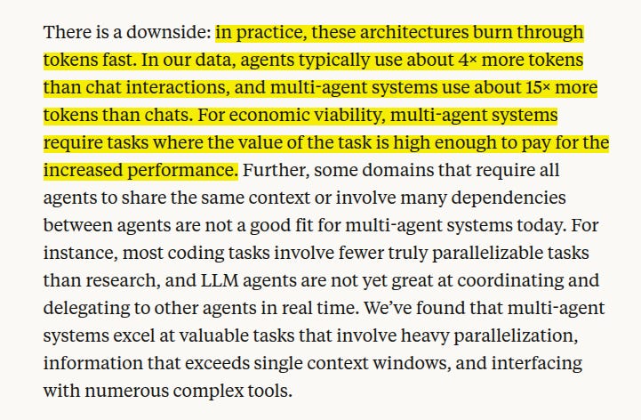 Multi-agent research consumes about 15× the tokens of chat and only pays off when the answer’s value outweighs that cost. Projects that need a shared giant context or tight real-time coordination, like most coding tasks, still strain current agents. Parallel, information-heavy investigations remain the sweet spot.