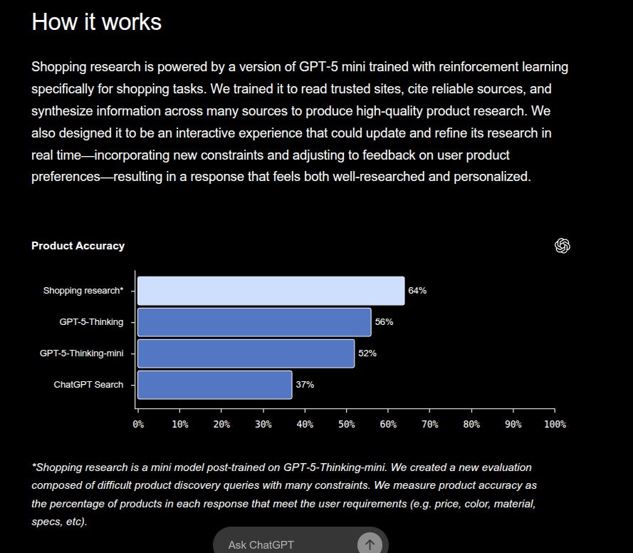 OpenAI evaluated this system on a set of hard product discovery tasks with many constraints and found that shopping research hit 64% product accuracy versus 56% for GPT-5-Thinking, 52% for GPT-5-Thinking-mini, and 37% for ChatGPT Search, where accuracy means the share of recommended products that actually satisfy every stated requirement such as price ceiling, size, or material. The product is designed so chats stay private from retailers, results are organic from public retail pages, and the system leans on high quality sources while filtering spammy sites, with an allowlist mechanism for merchants that want to be reliably included.