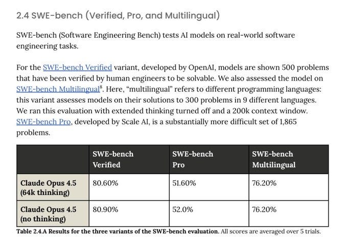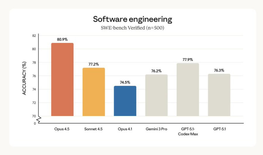 Its SWE-bench result is insane at 80.9% vs GPT-5.1 Codex-Max at 77.9%, Gemini 3 Pro at 76.2%. The model is built for agentic, multi-step workflows.