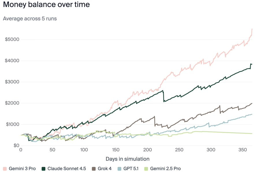 Vending-Bench 2: a benchmark for measuring AI model performance on running a business over long time horizons. Models are tasked with running a simulated vending machine business over a year and scored on their bank account balance at the end.