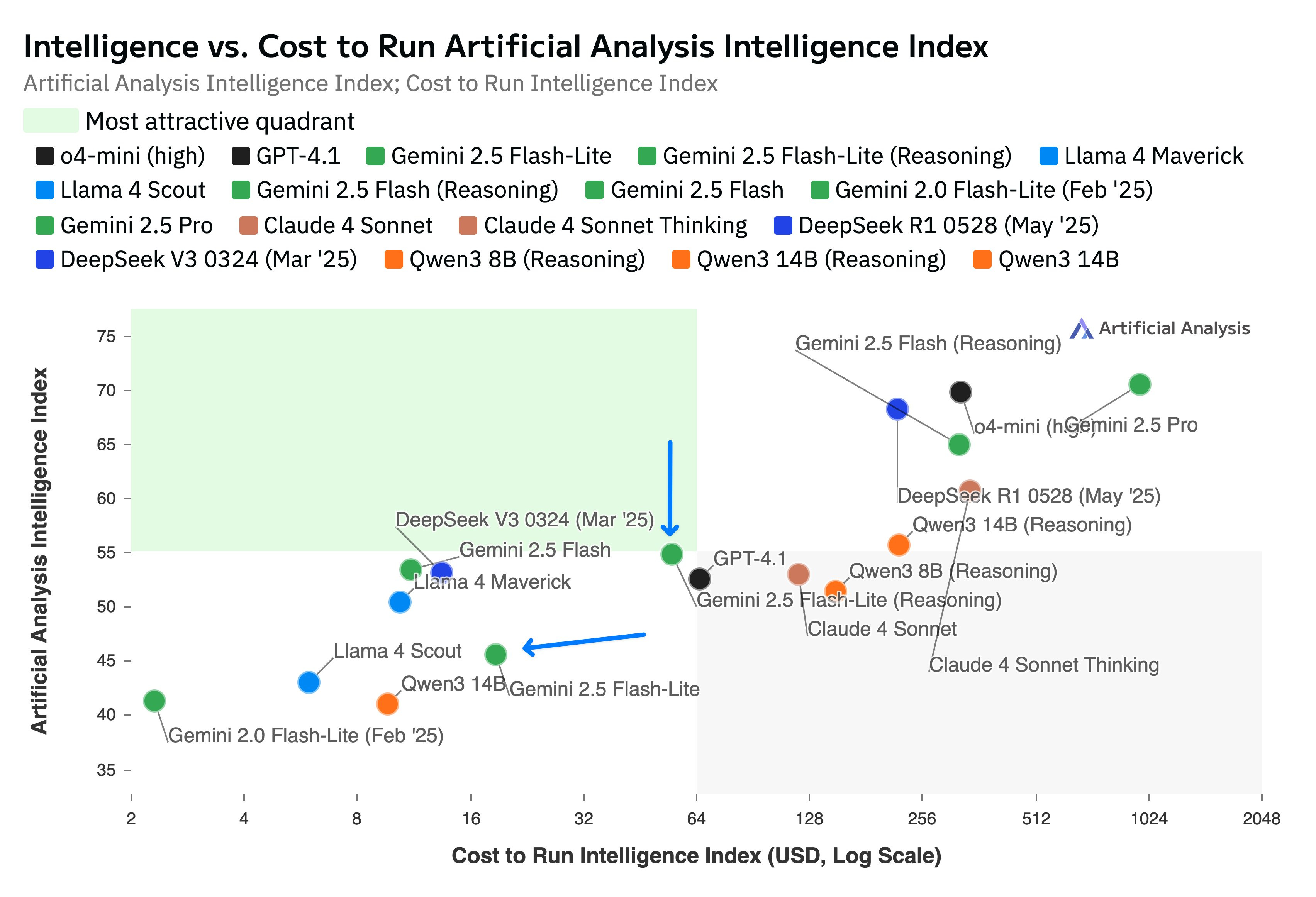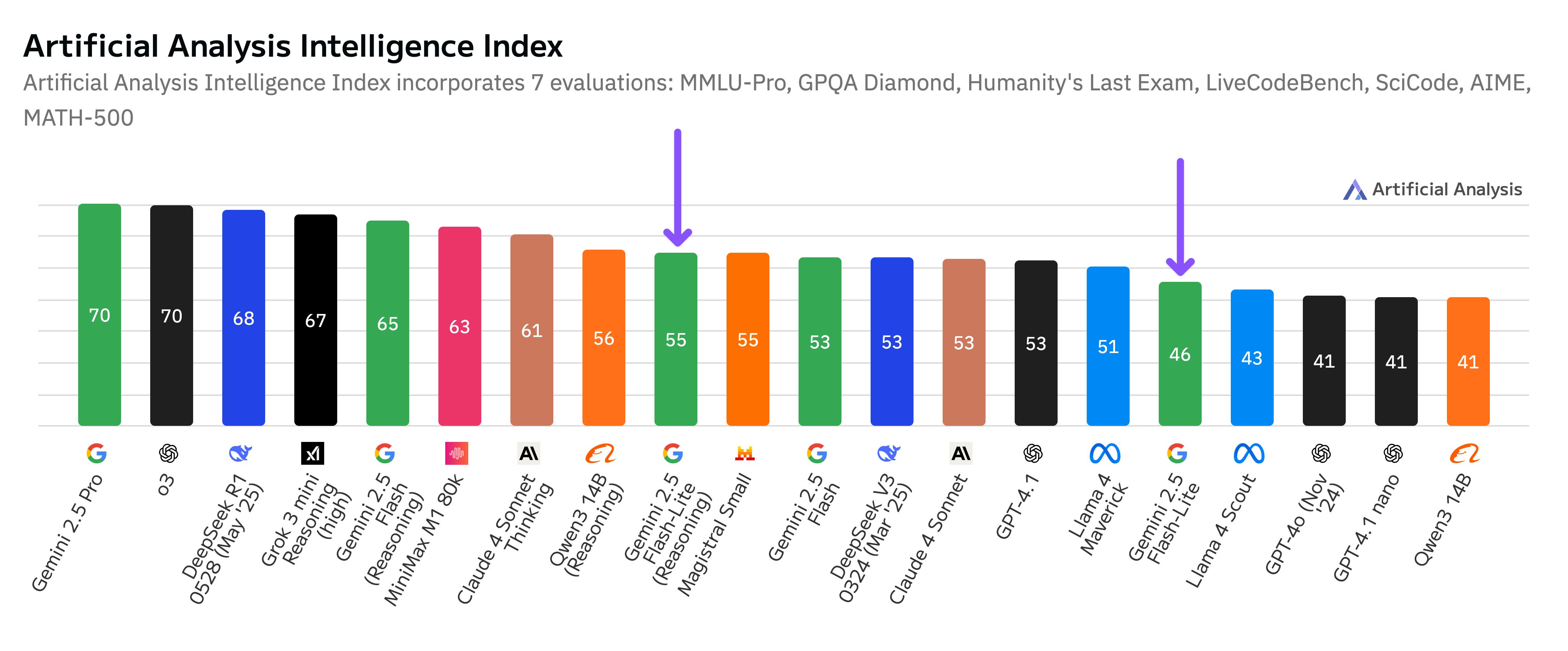 Artificial Analysis published independent benchmarks: Gemini 2.5 Flash-Lite combines really low cost, high speed, with a slightly lower intelligence.