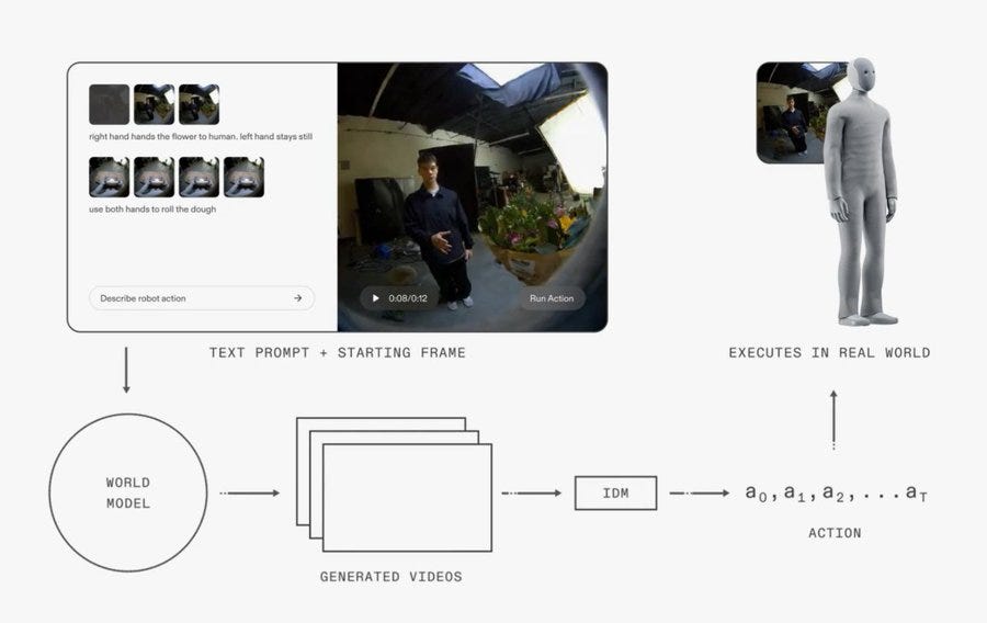 The big deal is that it swaps “predict actions directly” for “predict how the world will look next”, which lets the system reuse strong video prediction models trained on lots of human footage with far less robot data. In this setup, the world model handles high-level planning by generating plausible future motion, and a separate inverse dynamics model (IDM) translates frame-to-frame changes into joint commands that the robot can execute.