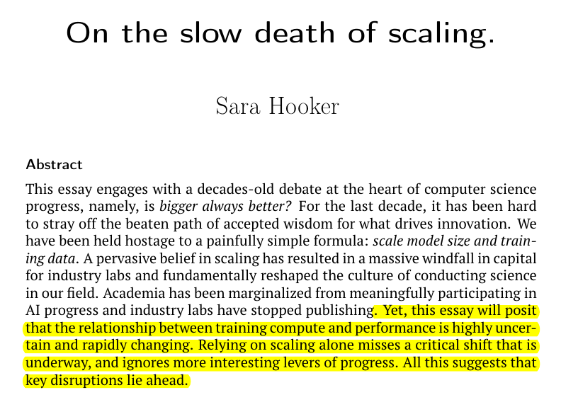 👨🔧 In her compelling essay, Sara Hooker calls this out: “The slow death of scaling.”
