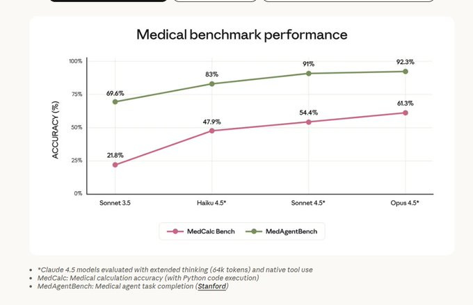 Opus 4.5 with 64K-token extended thinking and Python code execution scores 61.3% on MedCalc Bench, a medical calculation test, and 92.3% on MedAgentBench, a medical task suite, up from 21.8% and 69.6% on Sonnet 3.5, and it scores better on honesty tests for factual hallucinations.
