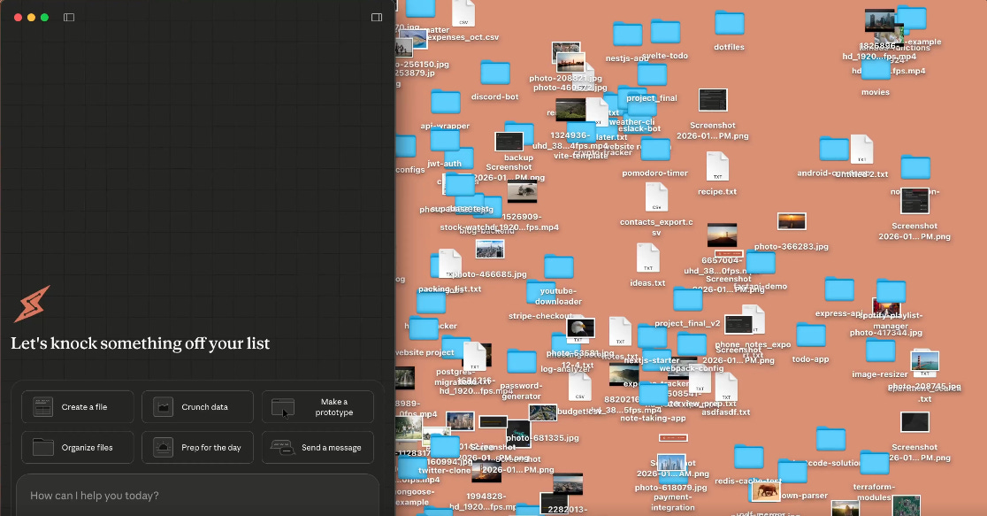 After a task is set, Claude writes a plan, executes steps, and reports progress along the way. Examples include sorting downloads, turning screenshots into an expense spreadsheet, and drafting a report from scattered notes.