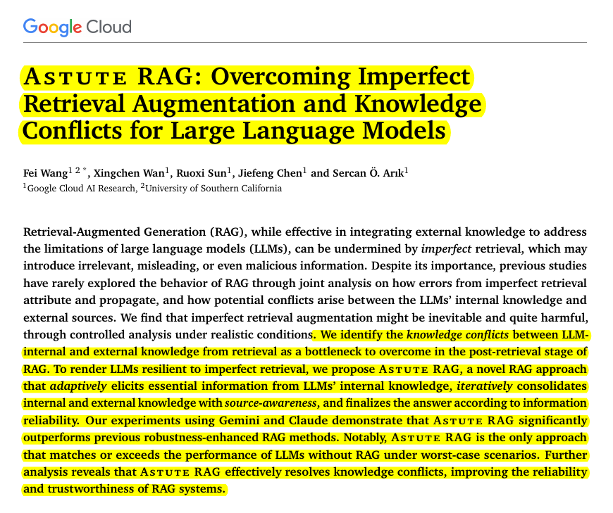 Fantastic Paper from @GoogleDeepMind. Astute RAG enhances LLM performance by resolving conflicts between internal and external knowledge sources.