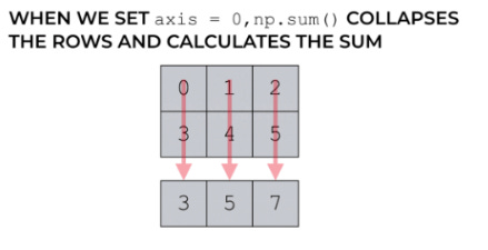 Remember that axis 0 refers to the vertical direction across the rows. That means that the code np.sum(2d_array, axis = 0) collapses the rows during the summation.