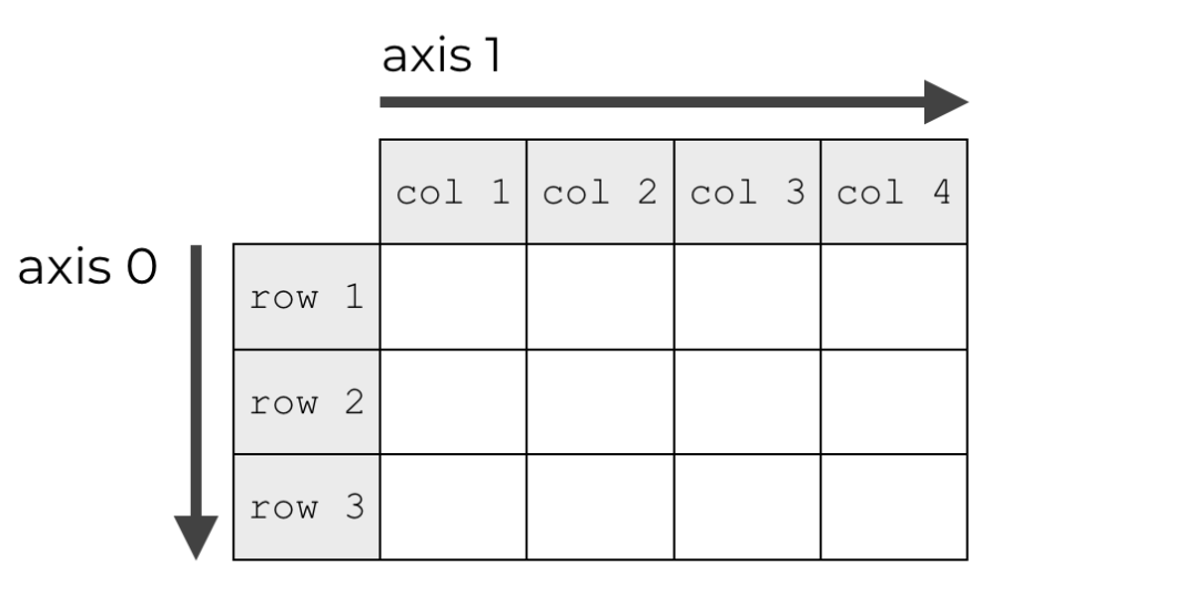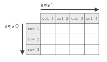 . Axis 0 is thus the first dimension (the "rows"), and axis 1 is the second dimension (the "columns").